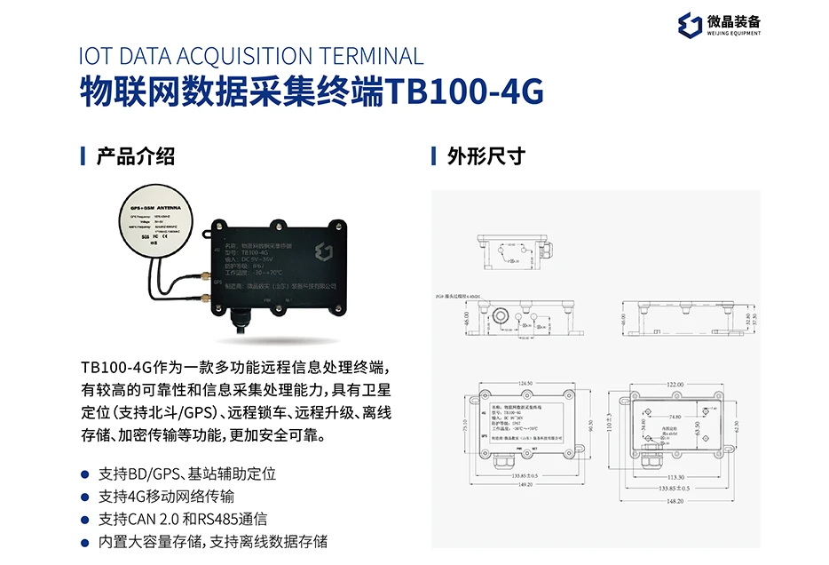 TB100-4G 作为一款多功能远程信息处理终端,有较高的可靠性和信息采集处理能力,具有卫星定位(支持北斗/GPS)、远程锁车、远程升级、离线存储、加密传输等功能,更加安全可靠。